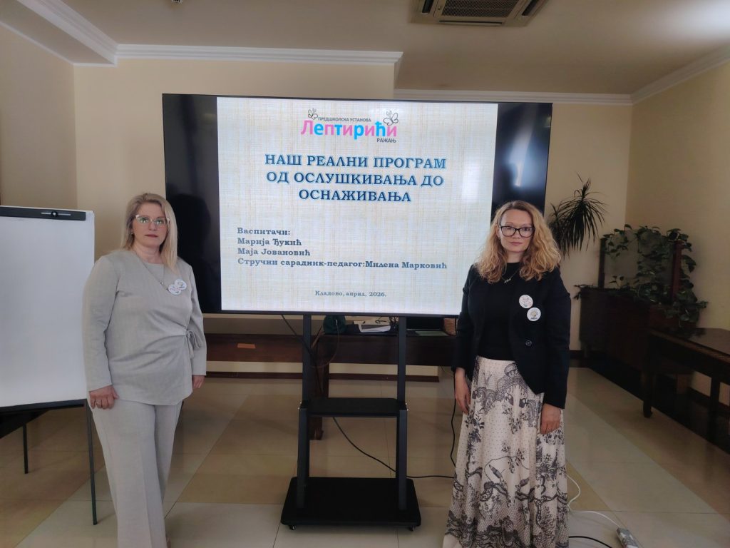 успешно је презентовао рад на тему „Наш реални програм од ослушкивања до оснаживања“. Овим радом приказан је контекст наше Предшколске установе у оквиру 3 године рада са истом групом децом. Приказали смо како деца граде разумевање и смисао кроз заједничко учешће са родитељима, васпитачима, вршњацима, члановима локалне заједнице у ситуацијама у којима препознају сврху свог учешћа и свој допринос.